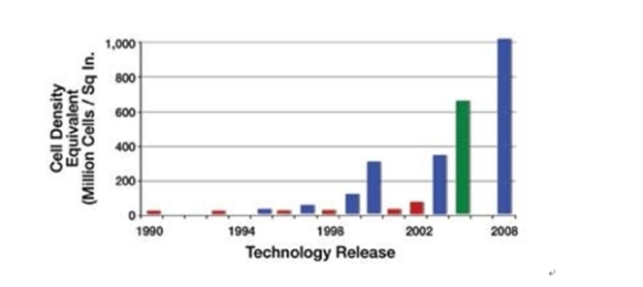 圖2顯示了Fairchild公司≤30V的N溝道MOSFET單元密度的進步。每個條形都表示新的工藝進步??梢钥吹剑谧罱氖曛?,單元密度從3200萬單元/平方英寸增加到現在的10億單元/平方英寸。