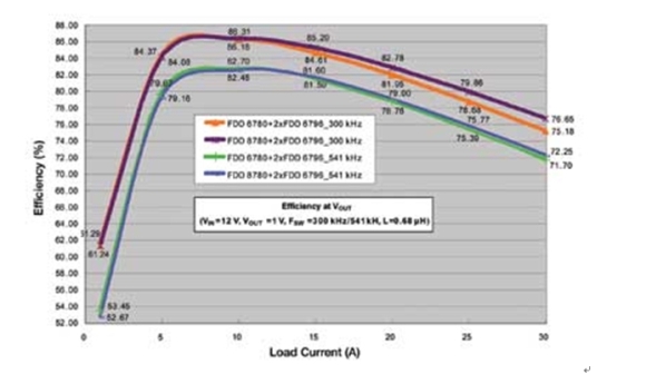 注意上面的兩條曲線,在滿載(30A)時,可以看到最新的器件的效率有1.5%的改進。同樣還是這兩條曲線,在負荷較小(15A)時,可以實現0.69%的改善。如果對整個負荷范圍積分,那么與今天常見的方案相比,使用最新的MOSFET器件時平均功率損耗可以降低8%~10%。即使在較高的開關頻率541kHz處,可以看到在負荷小時系統級效率仍然高于80%,而在滿載時效率大于70%。如果頻率繼續增加,那么開關損耗將急劇增加。