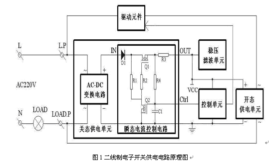 目前,二線制(無零線輸入)電子墻壁開關除供電電路之外的其它電路(如控制電路、驅動元件等)的供電,大多采用在開關關閉時由關態供電電路在電力線路的電壓回路中取電的方法(即關態供電方法,其電路稱為關態供電電路),以及在開關開啟時,由開態供電電路在電力線路的電流回路中取電的供電方法(即開態供電方法,其電路稱為開態供電電路)。關態供電方法一般采用阻容降壓整流濾波或變壓器降壓整流濾波,當開關關閉時,由于開關的控制電路需要維持正常待機工作,會消耗較小的功率,而在開關開啟的瞬間,開關消耗較大的功率,用繼電器作為開關的驅動元件更是如此。即使控制電路及微控制器在開關關閉時的待機功耗很低,為了保證開關的正常開啟,需要較大的關態供電電流,大于等于開關的最大工作電流,否則,開關開啟的瞬間電壓迅速下降,使得控制電路不能繼續正常工作。因此,在開關關閉時仍有較大的待機電流流過開關,當負載為節能燈或日光燈時,燈具會發生閃爍現象。為了不使燈具閃爍,有的采用在負載兩端并聯阻容元件作為負載連接器的方法,這就增加了安裝難度,使電子開關難以推廣。