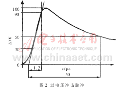 過電壓對于電源來說是一個非常有害的信號,雷電等引起的瞬時高電壓如果不加遏制,直接由電源引入RTU(遠程終端設備)則會影響其電源模塊的正常工作,使各功能模塊的工作電壓升高而工作不正常,嚴重時會損壞模塊,燒壞元器件(IC)。典型過電壓形成的沖擊電壓脈沖如圖2所示。