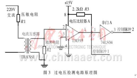 過電壓檢測電路原理圖如圖3所示。當有過電壓信號產生時,壓敏電阻被擊穿,呈現低阻值甚至接近短路狀態,這樣在電流互感器的原級產生一個大電流,通過線圈互感作用在副級產生一個小電流,再通過精密電阻把電流信號轉變為電壓信號;這個信號輸入到電壓比較器LM393后,電壓比較器LM393輸出高電平,經過非門A輸出的控制脈沖1控制電源回路,斷開開關電源電路,啟動備用電源。控制脈沖2 送到單片機的中斷口,單片機控制回路啟動A/D轉換,采樣過電壓的瞬時值。