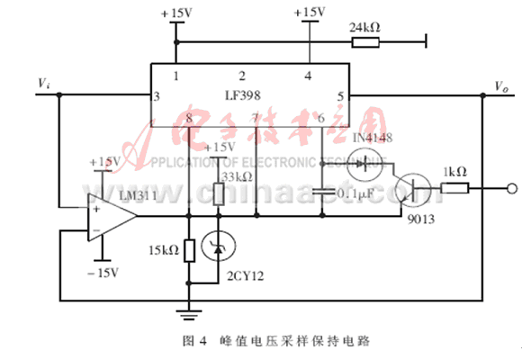 峰值電壓采樣保持電路如圖4所示。峰值電壓采樣保持電路由一片采樣保持器芯片LF398和一塊電壓比較器LM311構成。LF398的輸出電壓和輸入電壓通過LM311進行比較,當Vi>V0時,LM311輸出高電平,送到LF398的邏輯控制端8腳,使LF398處于采樣狀態;當Vi達到峰值而下降時,Vi<V0,電壓比較器LM311輸出低電平,LF398的邏輯控制端置低電平,使LF398處于保持狀態。由于LM311采用集電極開路輸出,故需接上拉電阻。由過電壓檢測電路輸出端送來的脈沖控制電子開關的導通,沒有過電壓時采樣電容放電,否則采樣電路一直跟蹤峰值的變化。