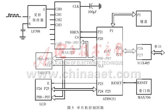 單片機控制回路如圖5所示。它的主要功能是完成對過電壓的瞬時值和峰值的檢測、過電壓次數的檢測、電源輸出電壓和電流的檢測,并通過鍵盤的操作顯示出各個檢測值的大小;同時通過485接口和上位機實現通訊,在有過電壓的時候通過控制回路啟動備用電源,實現對電源本身的保護。