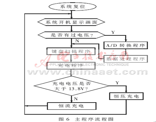 主程序由初始化、看門狗置位、鍵盤掃描子程序、中斷子程序組成。主程序主要進行分配內存單元、設置串行口等器件的工作方式和參數,為系統正常工作創造條件。在主程序運行的過程中,通過按鍵可以顯示檢測的各個量的值;同時在系統有過電壓和干擾信號產生時,液晶顯示屏會顯示提示信息,使電源實現“透明”,便于電源的管理。在本系統中,鍵盤采用的是由P1口組成的3×3行列矩陣式鍵盤。由于鍵盤程序的技術已經相當成熟,所以具體過程不做介紹。