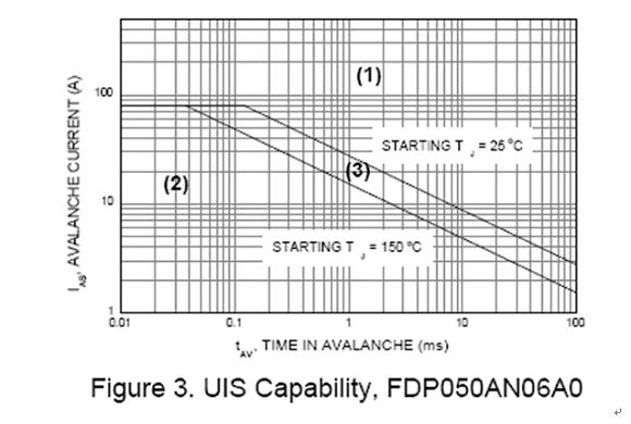 UIS 的評估方式是針對崩潰現象分析的一種很有用的方法。在圖三 UIS 安全工作區域中可區分為三大區域 (1) 大于 25 ° C 線或者是圖中靠右的區域 , (2) 低于 150 ° C線或者是圖中靠左的區域 , (3) 介于 (1) 與 (2) 的區域。其中 (1) 可清楚地了解此組件工作超出額定工作范圍之外 (2) 則是位于額定工作范圍之內。至于 (3) 的區域界定 我們需要得到此組件的起始 UIS 接合面溫度以決定其工作能力。稍后會在后面舉例說明如何求出此接合面溫度。