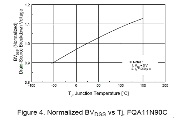 一般而言 假使 Drain 及 Source 電壓超過規格書所載明的最大額定電壓稍大一些 , 此時要讓場效應晶體管產生崩潰現象其實是不常發生的。圖四所表示的曲線為場效應晶體管的額定最大工作電壓 (BVDSS) vs 接合面溫度 (Tj), 其特性的表示是以正溫度特性變化 。當接合面溫度達到 120 ° C 時 , BVDSS 可達到將近 990V 。由此可知 , 在更高的接合面溫度條件下 , 場效應晶體管需要更高的 Drain 對 Source 的電壓以達到崩潰效應產生的必要條件。