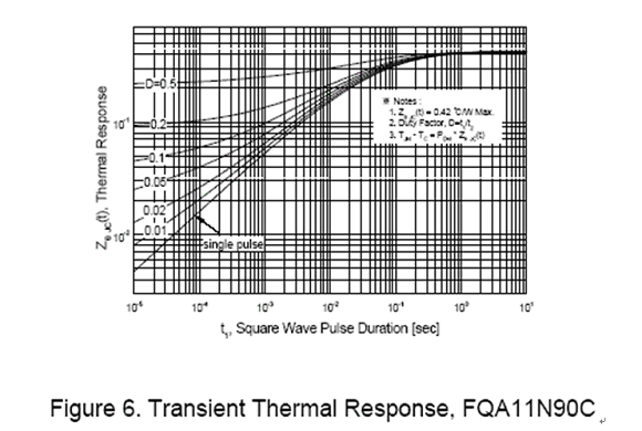 舉例說明 , 當一個 2KW 的電源脈沖加至 FQA11N90 的脈沖時間為 1uS 時 , 我們可依據圖六的曲線算出此脈沖功率對接合面所產生的溫升為