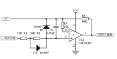 在如圖3所示的同步方波發(fā)生電路中,將工頻電壓同步取樣信號(hào)通過電阻 R7 加在運(yùn)算放大器I3的反相輸入端,與同相輸入端的+3V參考電壓進(jìn)行過零比較,那么運(yùn)算放大器的輸出端將得到脈沖寬度符合設(shè)計(jì)要求的方波電壓。