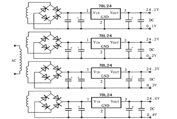 驅(qū)動電路需要4路相互隔離的直流電源為4路IGBT驅(qū)動電路供電,用220V/22V變壓器對4路交流電源分別整流,用電容器和78L24型電壓調(diào)整器穩(wěn)壓后輸出4路24V直流電壓,如圖2所示。