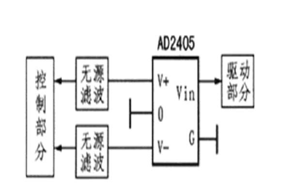 控制電路為弱電部分,極易受到干擾;驅(qū)動電路直接與外電路連接,是一個較強的干擾源;為了實現(xiàn)整個設(shè)備的電磁兼容,控制電路部分必須與驅(qū)動部分隔離。為了避免公共電源對控制電路產(chǎn)生干擾,應(yīng)對控制電路及驅(qū)動電路分別供電,EXB84l的電源電壓為+20 V,一般控制電路的供電電壓為5 V,因此,可以利用圖4所示的DC-DC微功率模塊進行電源隔離,采A2405D型微功率模塊實現(xiàn)電源的隔離。