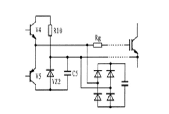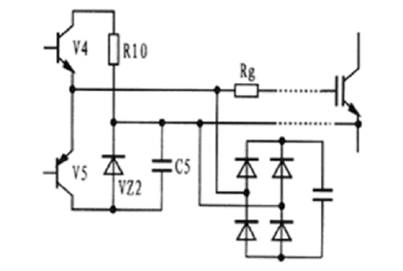 圖5所示為EXB841與IGBT柵-射極之間的連接電路原理圖。當(dāng)驅(qū)動電路中的V4導(dǎo)通時,IGBT處于正常導(dǎo)通狀態(tài),當(dāng)V5導(dǎo)通時,IGBT柵-射極之間通過穩(wěn)壓管VZ2提供一個-5V電壓加在其兩端,使IGBT關(guān)斷,此時V5處于臨界導(dǎo)通狀態(tài),穩(wěn)壓管VZ2處于反向偏置狀態(tài)。但由于集-柵極之間分布電容的影響,集-柵極之間的du/dt增大時,其通過分布電容形成的電流經(jīng)過,所以,要克服集-柵極之間的du/dt,確保穩(wěn)壓管不過壓,避免IGBT誤導(dǎo)通。克服du/dt的方法有二種:一是驅(qū)動電路輸出與IGBT柵-射極之間的連線采用雙絞屏蔽電纜,屏蔽層接地,二是采用快速吸收電路吸收過電壓。