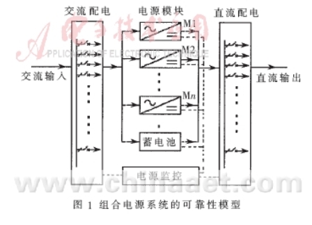 由圖1可以看出,組合電源系統正常輸出的可靠性表現為電源模塊并聯,再與蓄電池組并聯,然后與交流輸入配電和直流輸出配電相串聯的拓撲結構,與電源監控的可靠性無關。