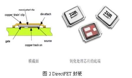 DirectFET的硅芯片封裝在一個銅外殼中。封裝的底部由一個特殊設計的芯片所組成,源極和柵極接觸襯墊可以直接焊接到PC板上。硅芯片上的一個專有鈍化系統(tǒng)將柵極和源極襯墊隔離以防止發(fā)生短路,并在器件安裝于電路板之上時起一個焊接掩膜的作用。鈍化層還能夠保護端接點和柵極構(gòu)造免受濕氣和其他污染影響。一個銅“外殼”從芯片的另一面形成漏極連接至電路板。該設計省去了引線框架和金屬線接點,并在占位面積與SO-8封裝相同的DirectFET封裝中將無芯片式封裝電阻(DFPR)降至0.1mΩ,而標準SO-8封裝則為1.5mΩ。