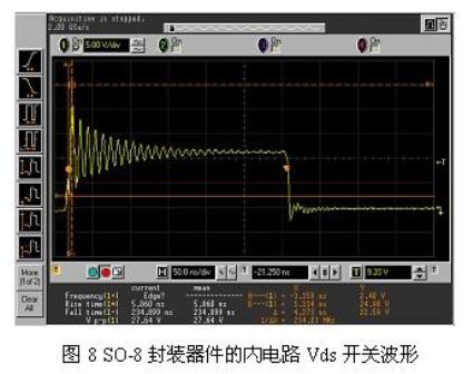 圖8示出的是SO-8器件對30A電流進行開關(guān)操作時的波形,