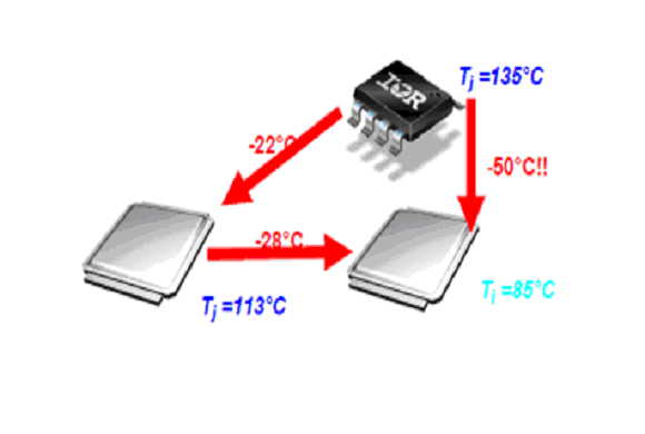 以一個每相30A的多相變換器為例,要滿足這個電流,用最好的單面散熱的SO8封裝MOSFET,比如標準的SO-8,無底的SO-8和無鉛的SO-8,每相要用五只,而雙面散熱的DirectFET 只需兩只。比較結(jié)果元件數(shù)減少了60%。