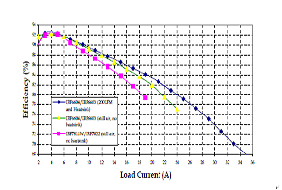 在一個12V輸入,1.3V輸出,工作頻率300kHZ的同步降壓變換器中,我們將IRF6603/IRF6604和IRF7822/IRF7811W這兩對管子做以比較,它們使用的硅片技術(shù)是相同的。負載電流增加時,此變換器電路板的溫度不得超過105°C。當電流達到18A時,這是SO8封裝在無冷卻氣流的條件下能夠承受的大電流,IRF6603的結(jié)溫要低50°C。比較DirectFET和SO-8在靜止空氣無散熱器條件下的效率曲線,在18A時前者的效率要高出3%。