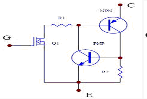 IGBT 有一定抗過電流能力,但必須注意防止過電流損壞。IGBT 復(fù)合器件內(nèi)有一個(gè)寄生晶閘管,所以有擎住效應(yīng)。圖5 為一個(gè)IGBT 的等效電路,在規(guī)定的漏極電流范圍內(nèi),NPN 的正偏壓不足以使NPN 晶體管導(dǎo)通,當(dāng)漏極電流大到一定程度時(shí),這個(gè)正偏壓足以使NPN 晶體管開通,進(jìn)而使NPN 和PNP 晶體管處于飽和狀態(tài),于是寄生晶閘管開通,門極失去了控制作用,便發(fā)生了擎住效應(yīng)。IGBT 發(fā)生擎住效應(yīng)后,漏極電流過大造成了過高的功耗,最后導(dǎo)致器件的損壞。