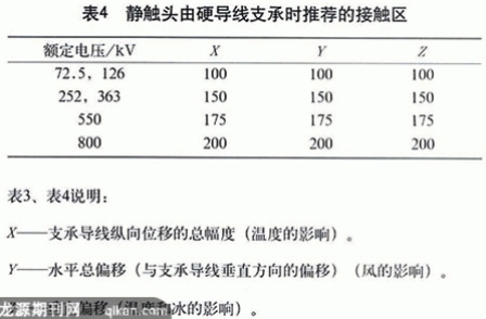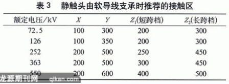 單柱垂直斷口隔離開關,因其靜觸頭懸掛在母線上,為了適應風力、溫度和冰雪的影響,確保隔離開關能可靠合閘,GB1985對接觸區(也稱鉗夾范圍)提出了推薦值,如表3、表4。在進行變電站設計和選用隔離開關時,應考慮到具體運行條件,確保靜觸頭處在規定的接觸區限值之內,使隔離開關能正確地分合閘。