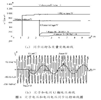 圖8(b)所示為電網U 相電壓與定子U 相電壓在同步過程中的變化曲線。由圖可知,當變頻器投入運行后,定子U 相電壓迅速建立,并與電網U 相電壓在相位、幅值上完全一致,達到同步的要求。