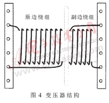 通過上面的分析知道,LLC諧振網(wǎng)絡(luò)需要兩個(gè)磁性元件Ls和Lp。然而,在實(shí)際應(yīng)用中,考慮到高頻變壓器實(shí)際結(jié)構(gòu),可以把磁性元件Ls和Lp集成在一個(gè)變壓器內(nèi),利用變壓器的漏感作為L(zhǎng)s,利用變壓器的磁化電感作為L(zhǎng)p。這樣一來,可以大大減少磁性元件數(shù)目。在設(shè)計(jì)時(shí),只要重點(diǎn)設(shè)計(jì)變壓器的漏感與變壓器磁化電感即可。因此,為增加漏感,需要在變壓器中加入適當(dāng)?shù)臍庀叮⑶铱刂谱儔浩髟边叺睦@線方式,如圖4所示。因?yàn)樽儔浩鞯脑吚@組與副邊繞組是完全分離的,因此無須使用隔離膠帶,這樣有助于形體的小型化。