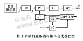 圖1中,(P+1)/P為高速雙模前置分頻器,分頻模數為P+1和P;A為吞脈沖可編程計數器;B為主可編程計數器;MC為??刂七壿嬰娐贰F浞诸l比為N=(P+1)A+P(B-A)=PB+A (1)