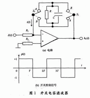 開關(guān)電容有源濾波器電路如圖1(a),其中S1和S2是由周期為2T的方波信號控制的理想電子開關(guān),方波控制信號p(t)波形如圖1(b),其占空系數(shù)為0.5。即在2kT<t<(2K+1)T期間兩開關(guān)接通A點(diǎn),在(2K+1)T<t<(2K+2)T期間兩開關(guān)接通B點(diǎn),其中K=0,1,2,…,是時(shí)段編號。