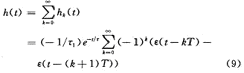 由式(8)可見,第k段的非零值時(shí)區(qū)為(kT,(k+1)T_),即各時(shí)段非零值區(qū)間互不重疊,對hk(t)關(guān)于k求和,得開關(guān)電容電路(對外)的單位沖激零狀態(tài)響應(yīng)h(t)為: