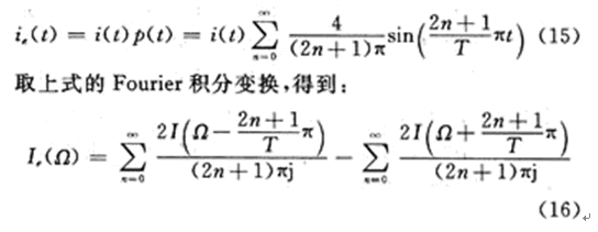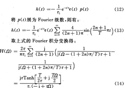 特別注意,求和式是一周期為2T的周期方波p(t)與單位階躍信號ε(t)的乘積,對上式取Fourier積分變換即得到開關(guān)電容電路系統(tǒng)頻譜函數(shù)(用j表示虛數(shù)單位,下同):