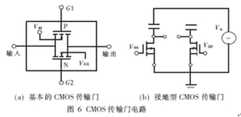 基本的CMOS傳輸門如圖6(a)所示。當(dāng)傳輸門導(dǎo)通時(shí),在輸入與輸出之間呈現(xiàn)低電阻,它允許電流向兩個(gè)方向中的任一方向流經(jīng)此門。此時(shí),輸入線的電壓必須比N溝器件的襯底電壓(VSS)為正,比P溝器件的襯底電壓(VDD)為負(fù)。這導(dǎo)致了傳統(tǒng)的CMOS傳輸門和以此為基礎(chǔ)構(gòu)成的CMOS模擬開關(guān)難以適應(yīng)大信號(hào)的傳輸[4~5]。