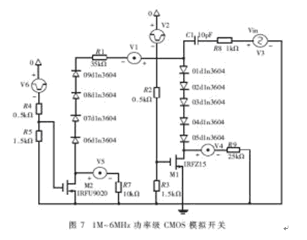 對(duì)約束VDD≥Vin≥VSS作深入分析可知,Vin之所以取值有限,根本原因在于其與V柵-襯底的關(guān)聯(lián)。使V柵-襯底獨(dú)立,避免Vin、Vout的影響,反過來將讓Vin輕松擺脫束縛。為此,本節(jié)設(shè)計(jì)了接地形CMOS傳輸門。原理電路如圖6(b)所示,具體的1M~6MHz高頻、功率級(jí)模擬開關(guān)電路見圖7。