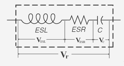 其中VC是由容抗XC產(chǎn)生的紋波電壓,VESR是由等效串聯(lián)電阻ESR產(chǎn)生的紋波電壓,VESL由等效串聯(lián)電感ESL產(chǎn)生的紋波電壓,△I為輸出紋波電流。
