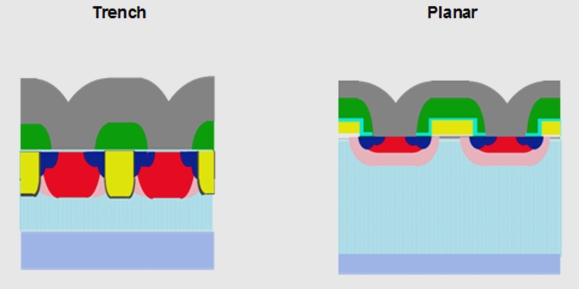 溝道型MOSFET的采用已成為當前大部分車載應用的標準。傳統的平面型MOSFET建立在硅晶圓表面之上,而溝道型MOSFET是在硅片上蝕刻垂直溝道,從而讓功率開關得以擁有更高的單元密度和更低的導通阻抗。由于這些電子機械系統大多數都采用了MOSFET H橋式電機驅動結構,兩個器件總是串聯以便使用更低電壓的MOSFET,同時仍然可以耐受常見的汽車高電壓沖擊現象。相比60V MOSFET,這些擊穿電壓更低的器件能夠把開關的導通阻抗降低50%,這意味著系統功耗減少50%,亦即系統發熱減少,最終把散熱要求降至最低。