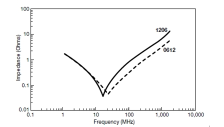 該模型給出了適用于絕大多數表面貼裝MLCC的正確阻抗曲線。記住電容值將隨溫度和直流偏置而變化。等效串聯電(ESR)隨溫度、直流偏置和頻率變化,而等效串聯電感(ESL)卻基本保持不變。對阻抗來說,也許最重要的部分是諧振點,因為這是衰減最大的頻率。眾所周知,計算諧振頻率的公式是: