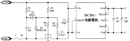 也可用熱敏電阻法來限制沖擊電流,但由于DC/DC電源的輸入電壓較低,輸入電流較大,在熱敏電阻上的功耗也較大,一般不用此方法。