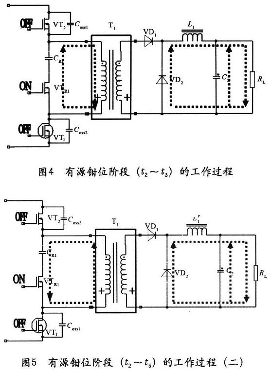 3)有源鉗位階段(t2~t3),如圖4和圖5所示,在亡2時刻鉗位開關(guān)管VTR在ZVS狀態(tài)下開啟,由于VTR1的體二極管先前已開通,VTRl的UDS電壓很低。鉗位開關(guān)管VTR1在整個階段處于開通狀態(tài),變壓器勵磁電流經(jīng)過鉗位開關(guān)管VTR1繼續(xù)給鉗位電容CR1充電,鉗位電容CR1充滿以后經(jīng)變壓器勵磁電感放電。次級在整個階段由L1續(xù)流經(jīng)VD2給負(fù)載供電,VD1截止。