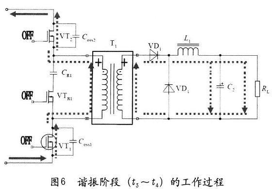 其中t1~t2和t3~t4的諧振時間是實現(xiàn)零電壓開關(guān)的關(guān)健,可以調(diào)節(jié)使零電壓開關(guān)做到最佳。