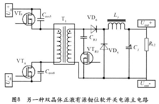 雙晶正激有源鉗位軟開關(guān)電源還有另一種結(jié)構(gòu),如圖8所示。其結(jié)構(gòu)與圖1所示的雙晶正激有源鉗位軟開關(guān)電源基本相似,只鉗位開關(guān)管VTR3以及鉗位電容CR3設(shè)置在副邊,鉗位電容CR3一端與變壓器的同名端相連,另一端與鉗位開關(guān)管VTR3的D極相連,鉗位開關(guān)管VTR3的S極與變壓器的異名端相連,請參閱圖8。其工作原理同在初級鉗位相差不多,這里不再講述。