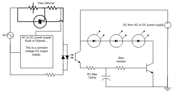許多高亮度LED驅(qū)動(dòng)器電路都帶有一個(gè)可作為LED調(diào)光之用的比較器。其中有些電流輸出很小,并可讀取引腳上的電壓,用以控制初級(jí)端開關(guān)或低頻占空比。在任何一種情況之下,關(guān)鍵都在于把AC占空比轉(zhuǎn)換為可用值。光耦合電路可以很好地做到這一點(diǎn),并提供隔離,故可以在初級(jí)端或次級(jí)端電路的任何地方使用這些數(shù)據(jù)。