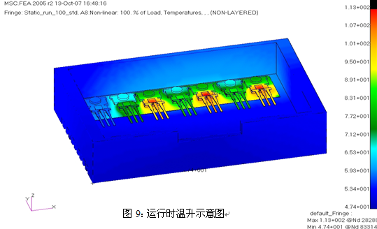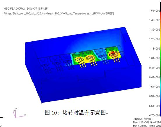 仿真條件:Ptotal=56.85W、Ta=45℃、控制器散熱器尺寸:70mm×110mm×30mm 、自然風冷,MOSFET安裝如圖8所示。