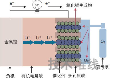 鋰—空氣電池的概念很早就提出來了(圖7)。由于在正極上使用空氣中的氧作為活性物質(zhì),因此理論上正極的容量密度是無限的,可加大容量。另外,如果負(fù)極使用金屬鋰,理論容量會(huì)比鋰離子充電電池提高一位數(shù)。