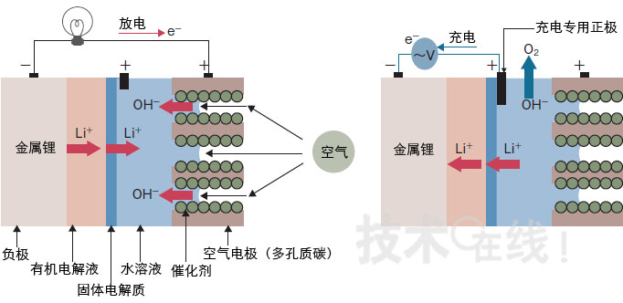 在該電池中,由放電反應(yīng)生成的并非是固體的Li2O,而是容易溶解在水性電解液中的LiOH(氫氧化鋰)。因此,氧化鋰在空氣電極堆積后,不會(huì)導(dǎo)致工作停止。另外,水及氮等也不會(huì)穿過固體電解質(zhì)的隔壁,因此不存在與負(fù)極的鋰金屬發(fā)生反應(yīng)的危險(xiǎn)。而且,在充電時(shí),如果配置充電專用的正極,還可防止充導(dǎo)電致空氣電極的腐蝕和老化。