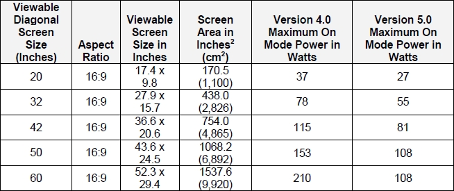 表1:“能源之星”4.0版及5.0版電視規范的工作能耗要求