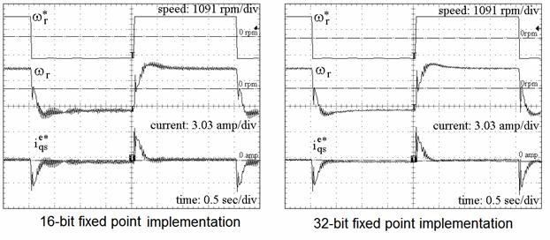 比例積分控制器的積分項總是采用 32 位字長甚至是 16 位定點(diǎn)版本,根據(jù)以往的經(jīng)驗(yàn),采用 16 位積分累加的結(jié)果明顯地差的多。采用類似仿真的策略將 ±0.5 pu 的步長應(yīng)用于系統(tǒng)速度參考。d 軸及 q 軸電流和估測速度作為速度命令的步長,這些也證實(shí)了仿真結(jié)果。在瞬態(tài)及穩(wěn)態(tài)狀態(tài)下,仿真結(jié)果的響應(yīng)相關(guān)性很強(qiáng)。不良振蕩瞬態(tài)及因采用 16 位實(shí)施造成的瞬態(tài)時間增加等情況下的量化效應(yīng)是可以驗(yàn)證的。