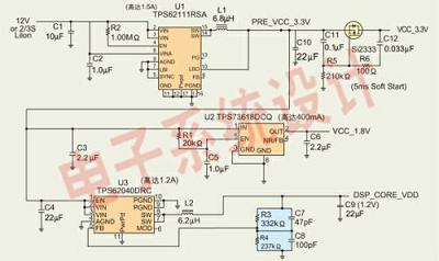 我們構(gòu)建了若干個(gè)電源管理參考設(shè)計(jì),并進(jìn)行數(shù)字音頻/視頻應(yīng)用的測(cè)試。這些設(shè)計(jì)均采用TI的TMS320DM6?43和TMS320DM6?46處理器,這些處理器能滿(mǎn)足排序、電壓精度和啟動(dòng)要求。圖1是12V電源的參考設(shè)計(jì)電路圖。該設(shè)計(jì)采用TPS62111同步降壓轉(zhuǎn)換器、TPS62040同步降壓轉(zhuǎn)換器以及TPS73618低壓降調(diào)節(jié)器,它們分別提供3.3V、1.2V和1.8V電壓軌。這種參考設(shè)計(jì)包含一個(gè)簡(jiǎn)單的外部MOSFET、電阻和電容延遲電路,以使3.3V電壓軌能滿(mǎn)足自升壓模式排序方案要求。TPS62040不但提供1.2V的內(nèi)核電壓,而且還可滿(mǎn)足引腳5軟啟動(dòng)電容的排序要求。這種解決方案的容差為±3%,效率在90%以上。為滿(mǎn)足主機(jī)升壓模式排序方案要求,可以將一個(gè)類(lèi)似的MOSFET、電阻以及電容電路增加到1.2V電壓軌。