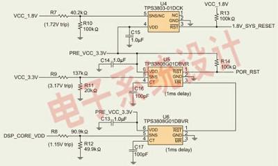 圖2是復(fù)位電路。該電路采用TPS3808和TPS3803電源電壓監(jiān)控器來(lái)監(jiān)控電壓軌的變化情況。請(qǐng)采用最小值的TPS3808G01(U5)來(lái)設(shè)計(jì)復(fù)位電路電源。如果需要大于3.3V電壓軌/1.5A電流和1.2V電壓軌/1.2A電流,那么TPS54350和TPS54110SWIFTDC/DC轉(zhuǎn)換器可能會(huì)被分別用于實(shí)現(xiàn)3A和1.5A電流。SWIFT穩(wěn)壓器具有基于DaVinci技術(shù)的數(shù)字視頻EVM的特點(diǎn)。如欲了解更多采用了線性調(diào)節(jié)器、TPS40KDC/DC轉(zhuǎn)換器、TPS62xxxDC/DC轉(zhuǎn)換器或多輸出電源管理單元(PMU)的5V和12V輸入電源