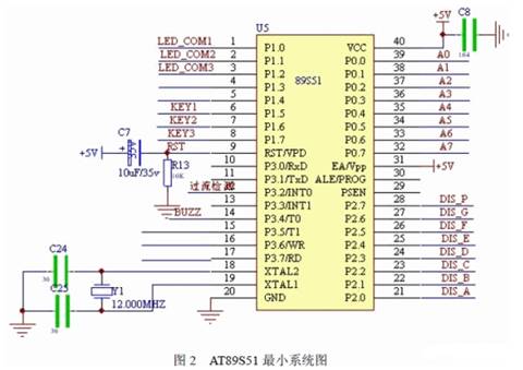 主要由AT89S51 最小系統控制,它要完成鍵盤控制、預置電壓顯示控制、短路保護控制 及報警控制等功能。AT89S51 最小系統如圖2 所示。