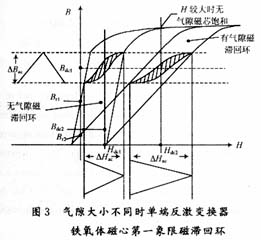 與正激開(kāi)關(guān)電源變壓器不同,此反擊電源變壓器兼有儲(chǔ)能的作用,流過(guò)直流電流成分時(shí)容易飽和。所以要使用帶有氣隙的磁芯。原理如圖3所示。