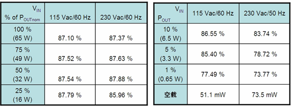 表2:基于NCP1237的65 W筆記本適配器工作能效及待機能耗測試結果。
