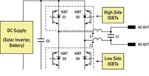 因為這個設(shè)計所實施的逆變器拓撲屬于全橋,所以有關(guān)的太陽能逆變器采用了4個高電壓IGBT,如圖1所示。在這個電路中,Q1和Q2晶體管被指定為高側(cè)IGBT,而Q3和Q4則為低側(cè)功率器件。為了要保持總功率耗損處于低水平,但功率轉(zhuǎn)換則擁有高效率,設(shè)計師要在這個DC/AC逆變器解決方案正確應(yīng)用低側(cè)和高側(cè)IGBT組合。