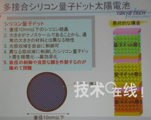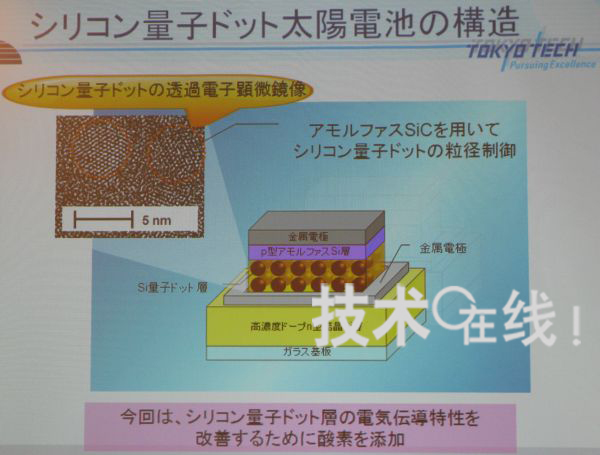 東京工業(yè)大學(xué)教授小長井誠研究小組,大幅提高了利用硅量子點(diǎn)的太陽能電池的開放電壓(Voc)及I-V特性形狀因子(FF)數(shù)值。2010年3月10日,該消息是在應(yīng)用物理學(xué)會舉行的2010年春季應(yīng)用物理學(xué)會學(xué)術(shù)演講會的會前新聞發(fā)布會上宣布的。